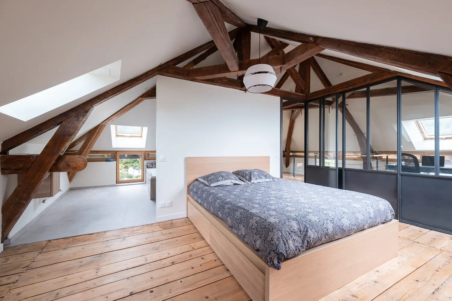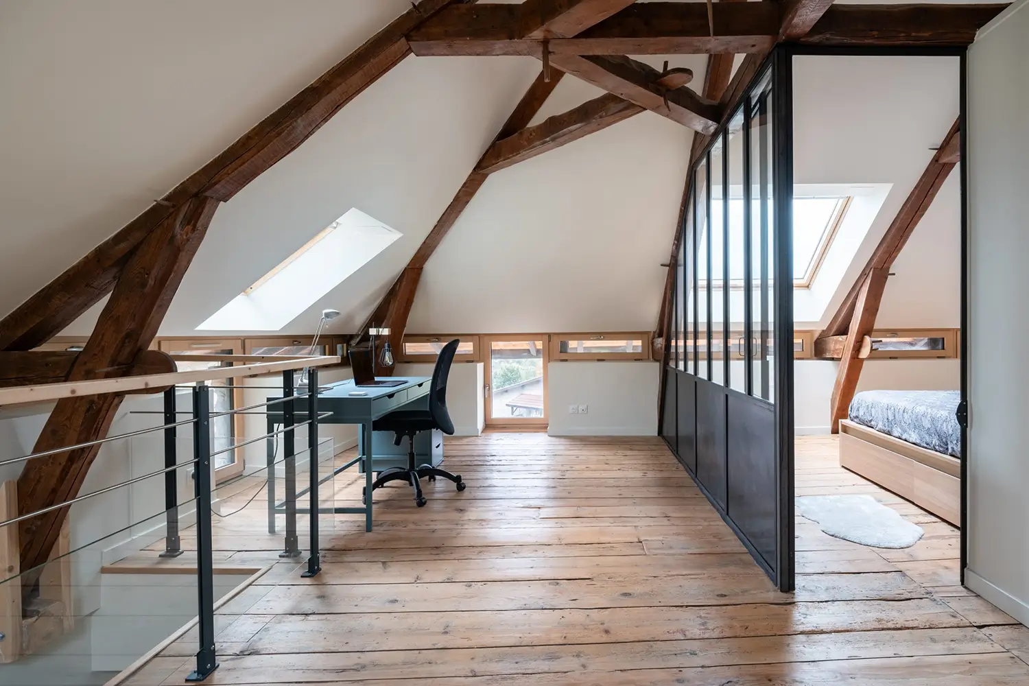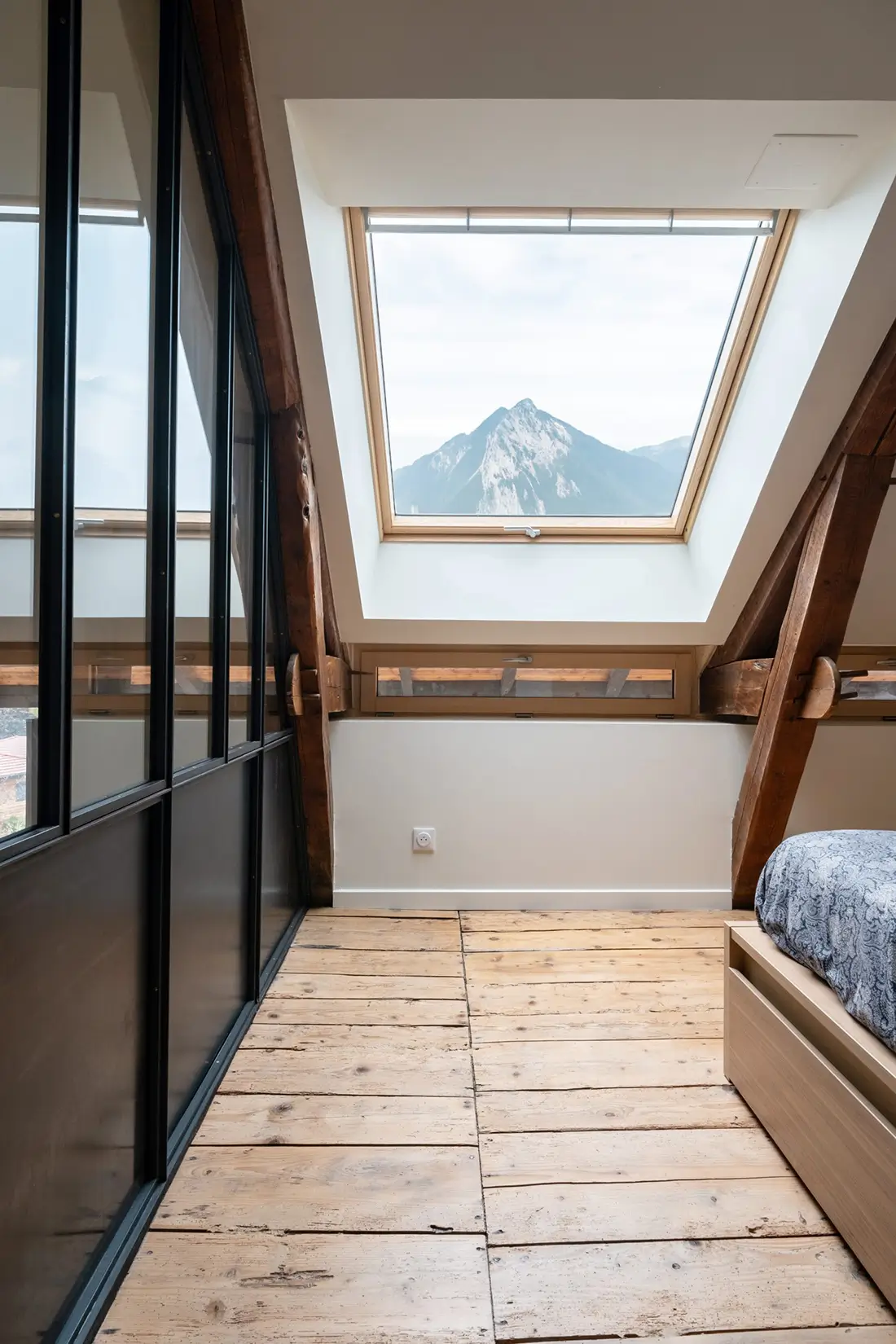Création de l’étage du comble d’une belle maison ancienne typique du Dauphiné. La remarquable charpente est mise en valeur par la conservation d’une espace unique où sont néanmoins créés une suite parentale, un dressing et un bureau. L’arase des murs est couronnée de fenêtres, respectant une typicité toute locale de charpente ventilée, pour ces combles autrefois séchoir à noix.
