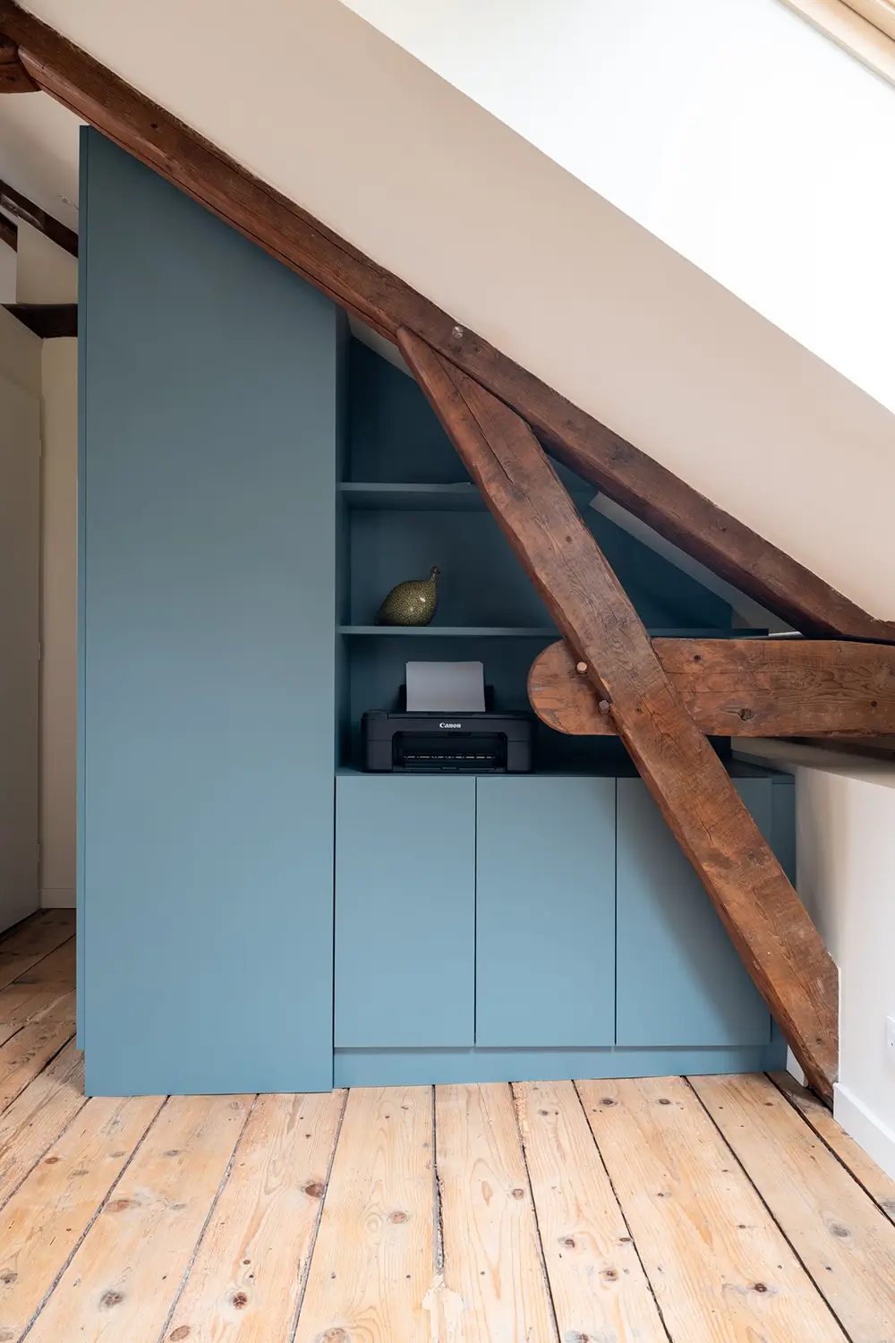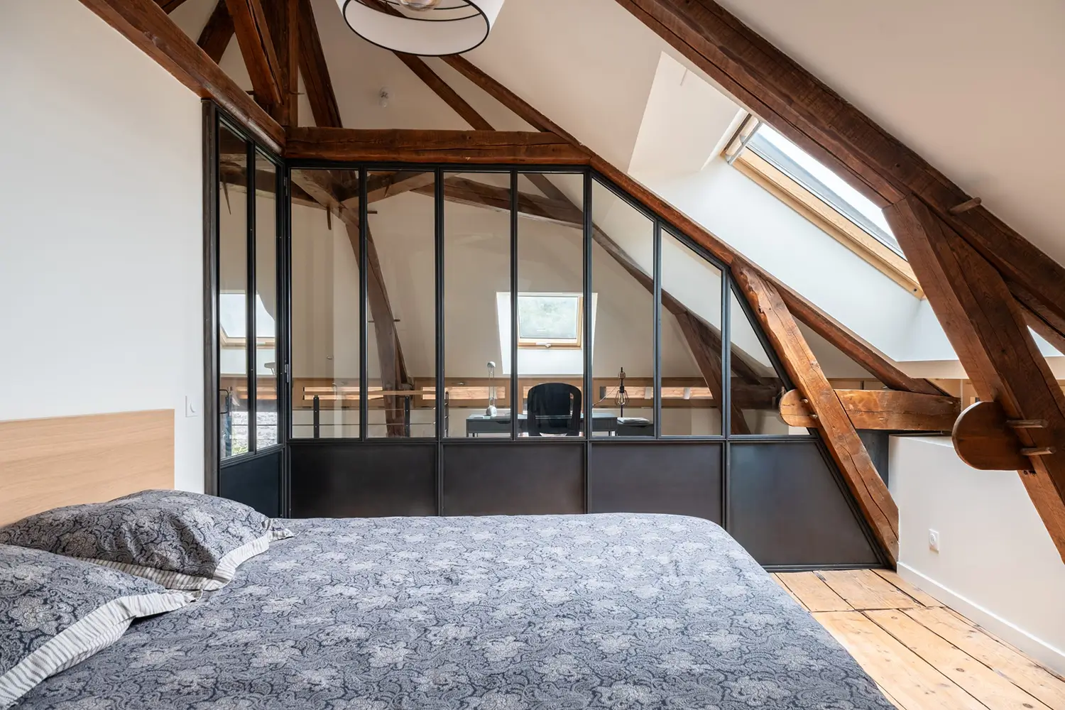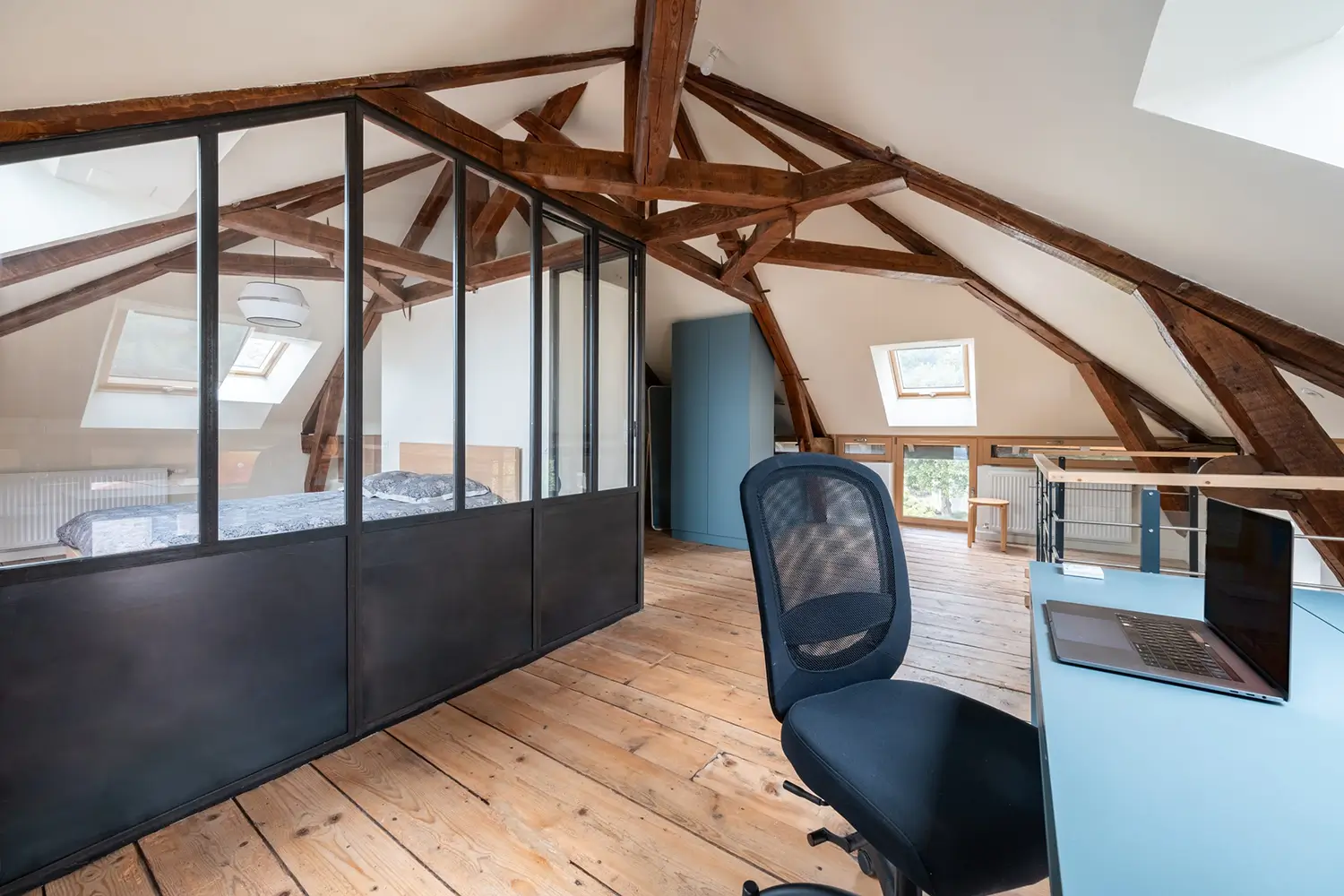 Création de l’étage du comble d’une belle maison ancienne typique du Dauphiné. La remarquable charpente est mise en valeur par la conservation d’une espace unique où sont néanmoins créés une suite parentale, un dressing et un bureau. L’arase des murs est couronnée de fenêtres, respectant une typicité toute locale de charpente ventilée, pour ces combles autrefois séchoir à noix.
