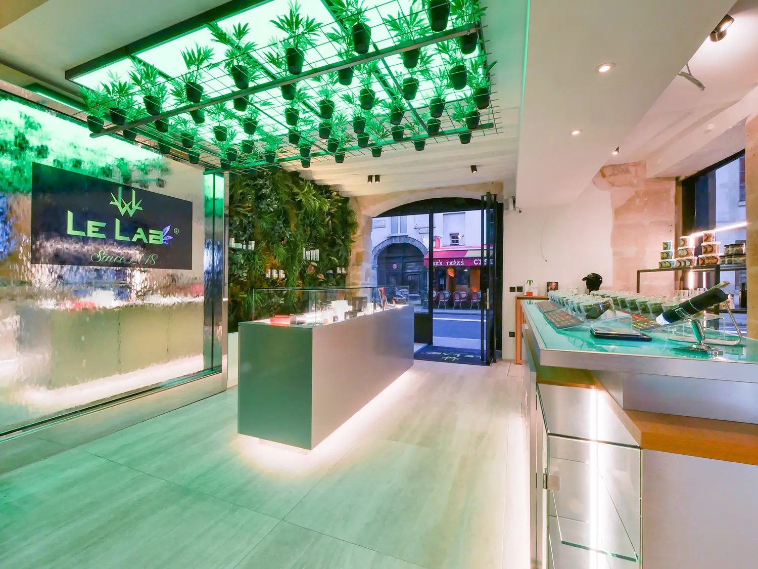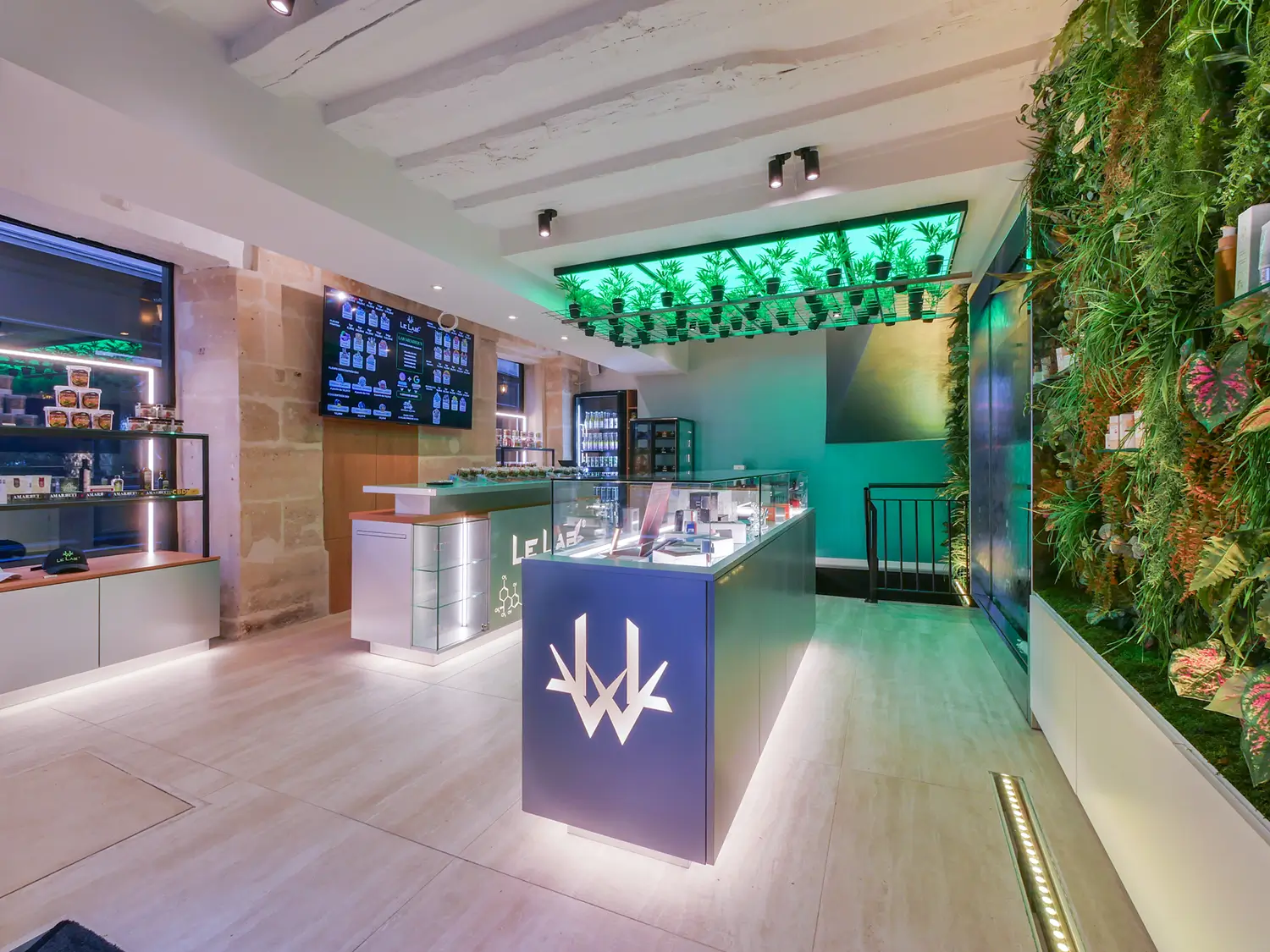 Un mur végétal réalisé par la société Odzo anime tout un côté de la boutique.
