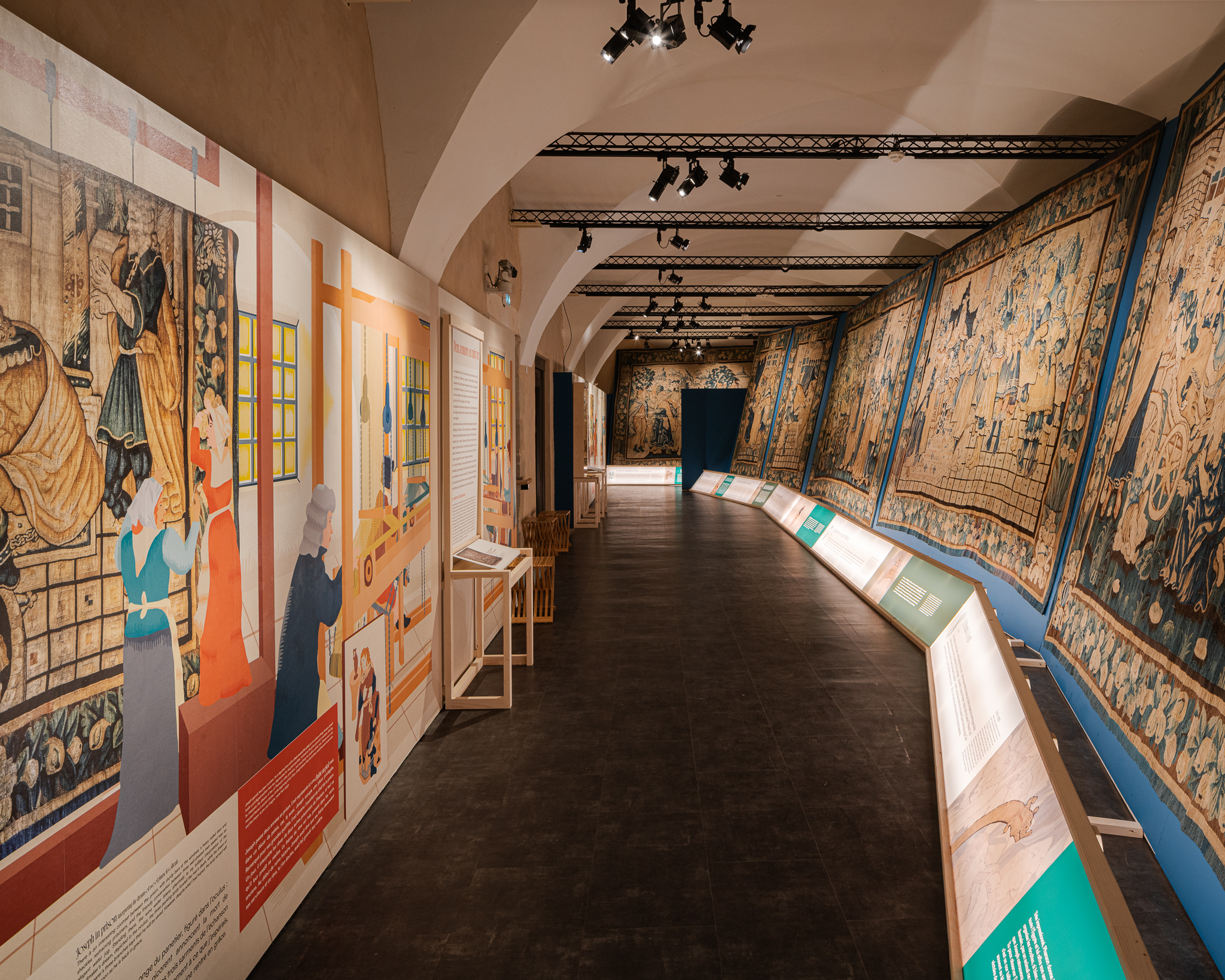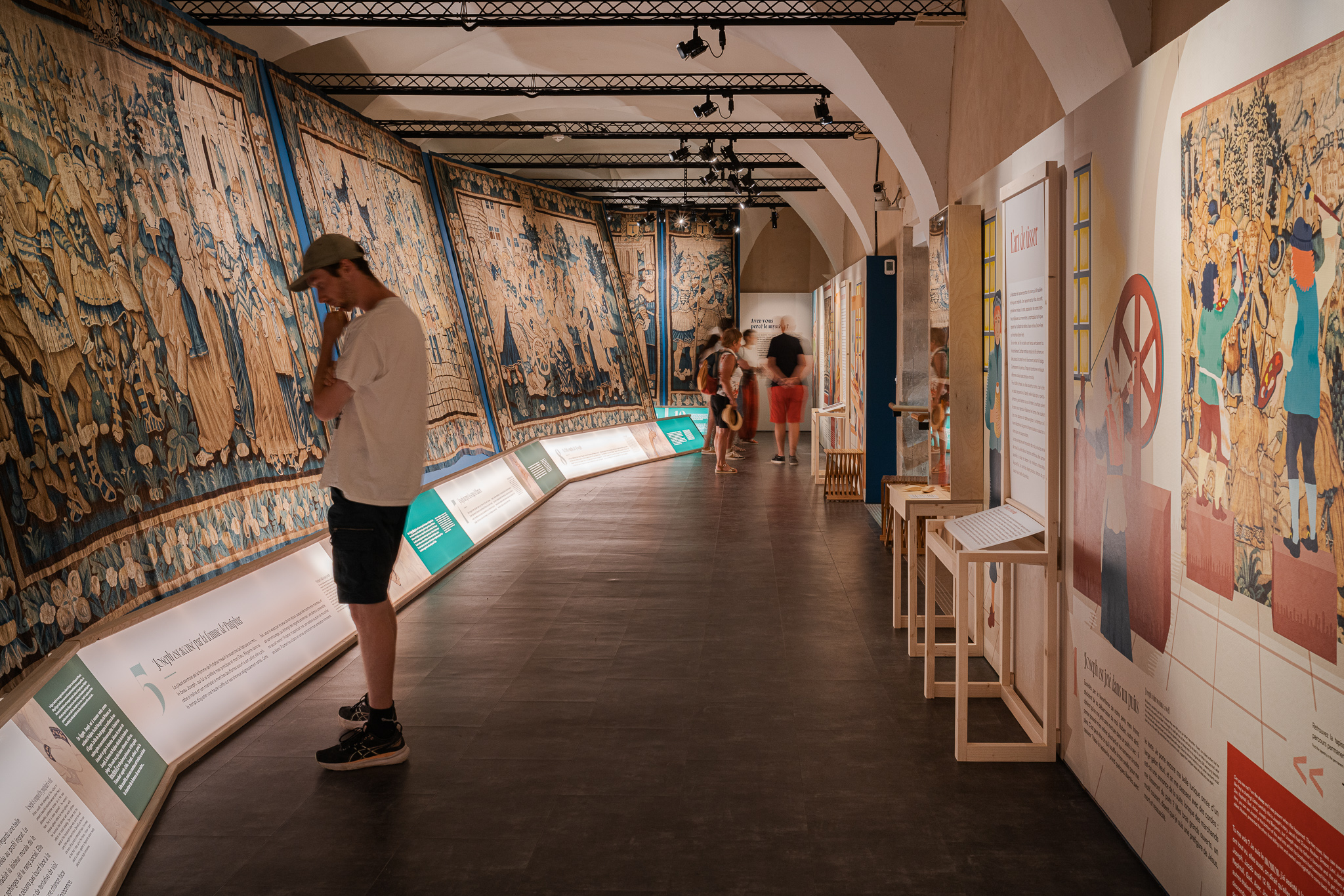 La tenture, sa thématique, est rendue aussi accessible qu’une BD grâce à de gros cartels descriptifs et ludiques où les enfants pourront jouer à retrouver des morceaux choisis des tapisseries.
