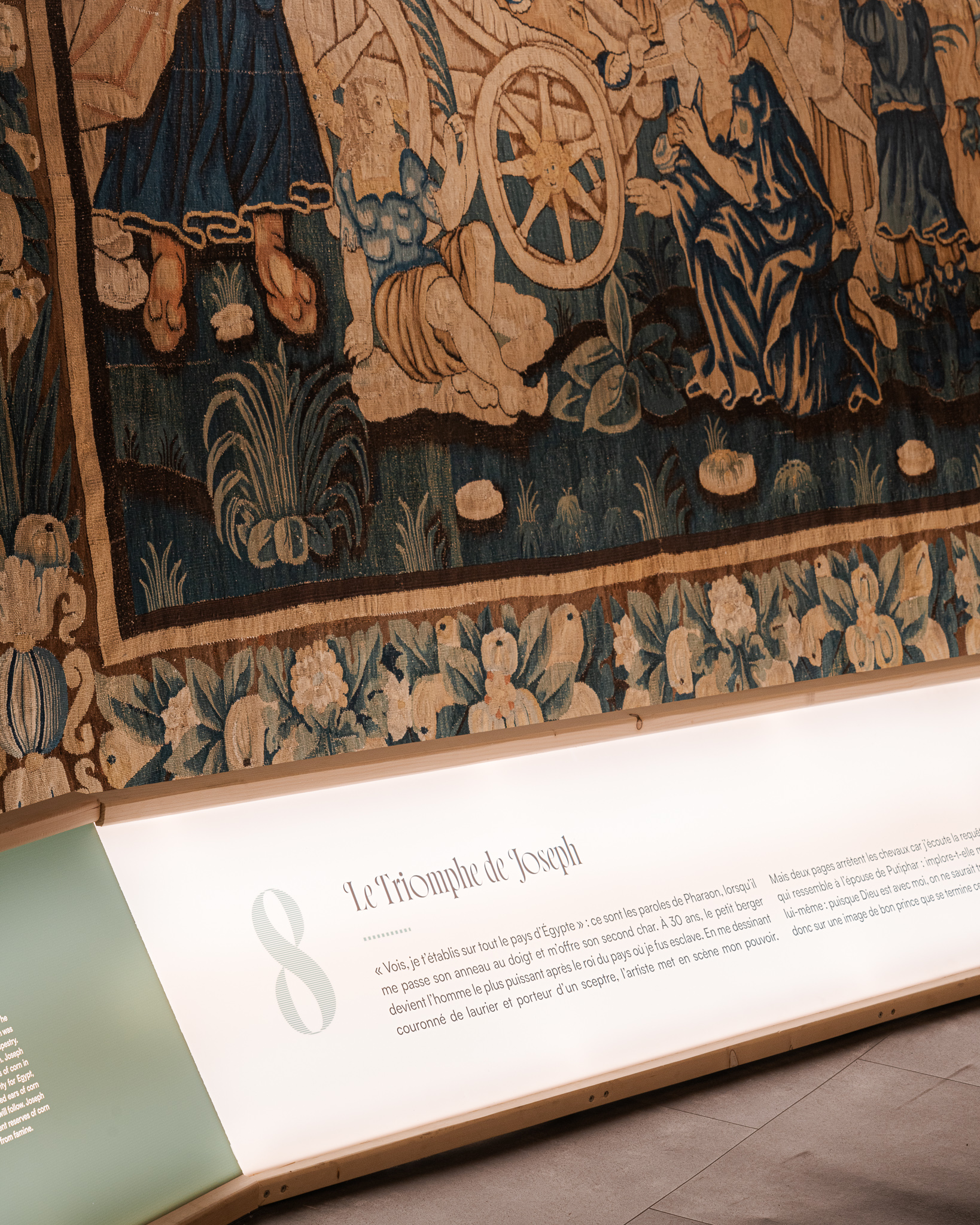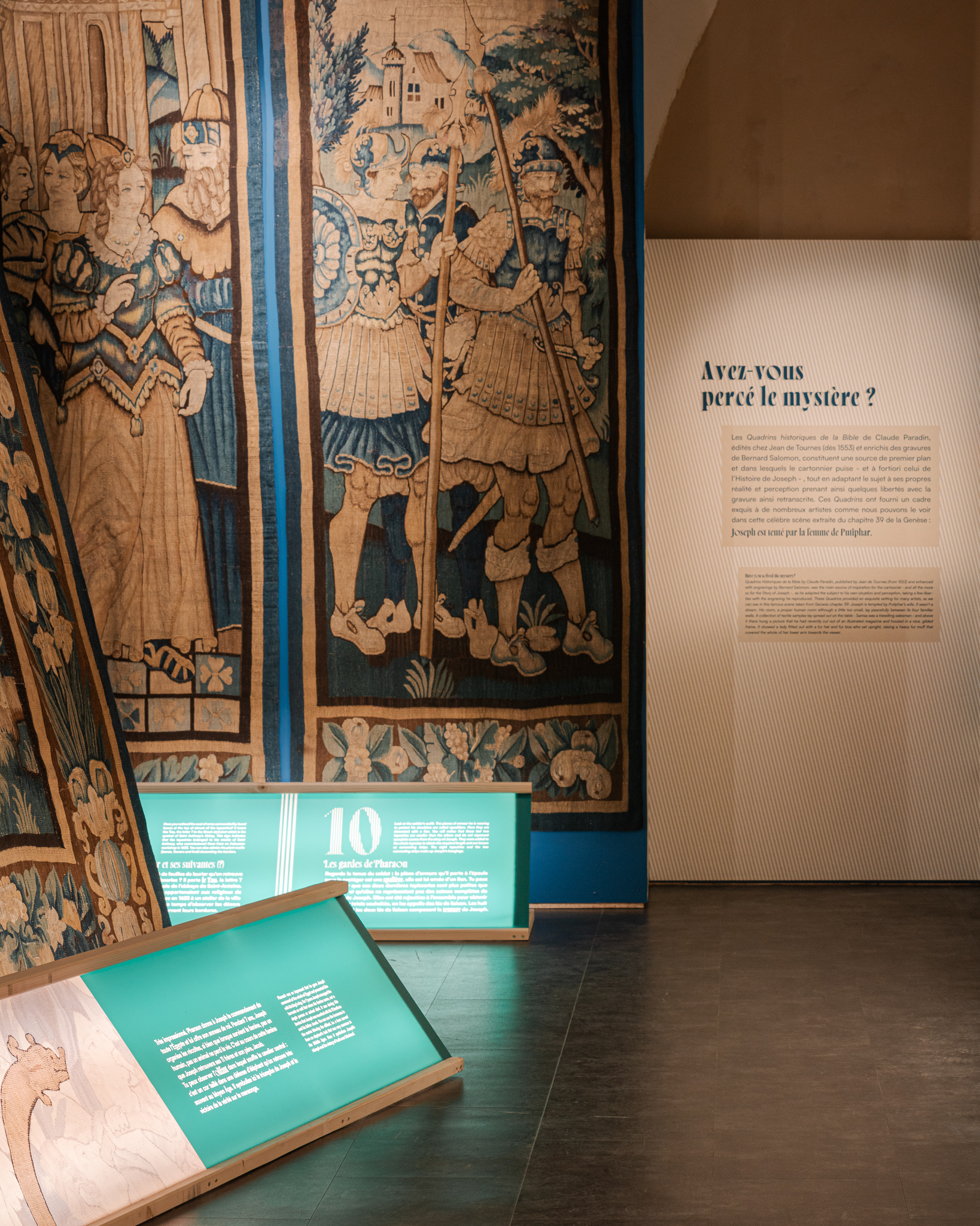 L’exposition présente une tenture Aubussonnaise, commandée au 17e siècle par les Antonins, relatant la vie de Joseph.